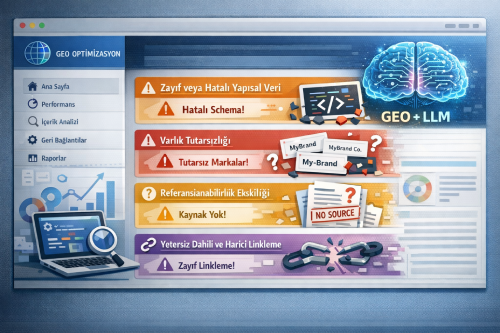 GEO (Generative Engine Optimization) hataları, bir web sitesinin içeriğinin, yapısının veya otorite sinyallerinin, yapay zeka cevap motorları (LLM'ler) tarafından doğru bir şekilde anlaşılamamasına, yorumlanamamasına veya güvenilir bulunmamasına yol açan eksiklikler bütünüdür. Analizlere göre yapay zeka özellikleri, en yararlı ve güvenilir bilgileri sunmayı amaçlar; bu nedenle GEO hataları yapan bir site, bu güvenilirlik testini geçemez. Bu hatalar, geleneksel SEO'daki gibi sadece birkaç sıra gerilemeye neden olmaz; markanızın yapay zeka tarafından oluşturulan yanıtlardan tamamen dışlanmasıyla sonuçlanabilir. Çünkü LLM'ler, belirsiz, tutarsız veya doğruluğu teyit edilemeyen bilgileri kaynak olarak kullanmaktan aktif olarak kaçınır.